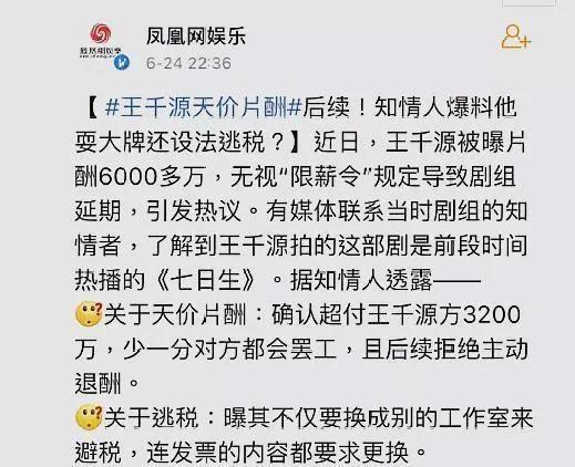 由此开端,王千源变乱曾经从索要天价片酬上降为涉嫌遁税漏税。凤凰网文娱厥后也正在微专上跟进了此事。