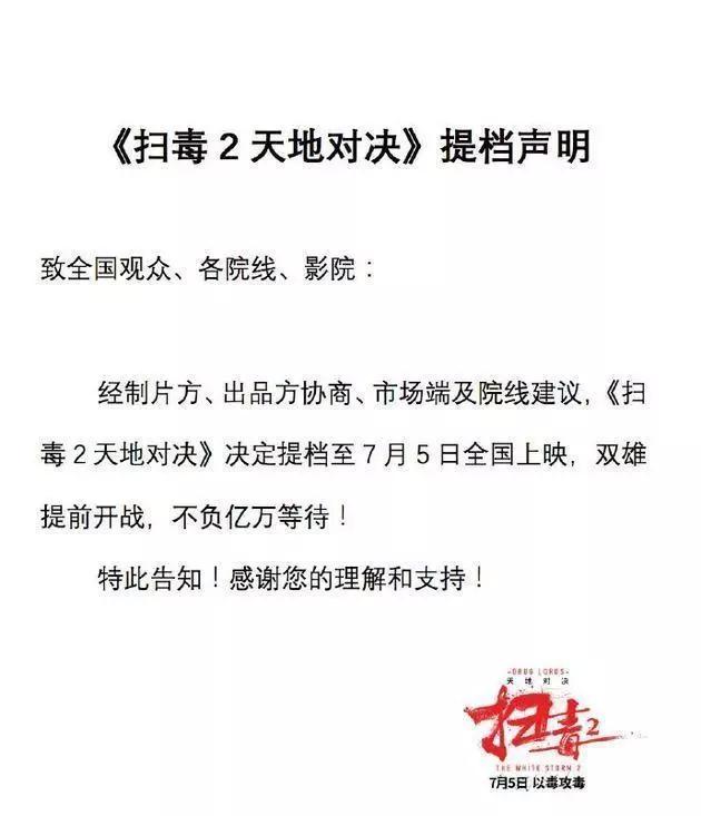 那一撤档,自制了刘德华战古天乐主演的影戏《扫毒2》。据最新动静,《扫毒2》决议提早两周上映,由7月19日提早至7月5日。业内助士估计,如若《八佰》能准期上映,估计票房最少会打破20亿,如今《扫毒2》挖补了那个空缺。