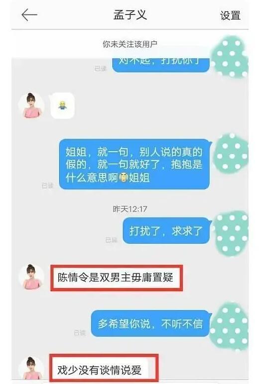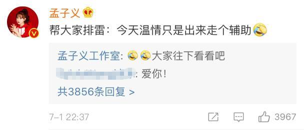 其时有网友供证孟子义,问她能否取男主有豪情戏,她的回应是本人的戏很少,也出有战男主道情道爱,而且很必定的报告各人那是一部单男主戏无庸置疑。