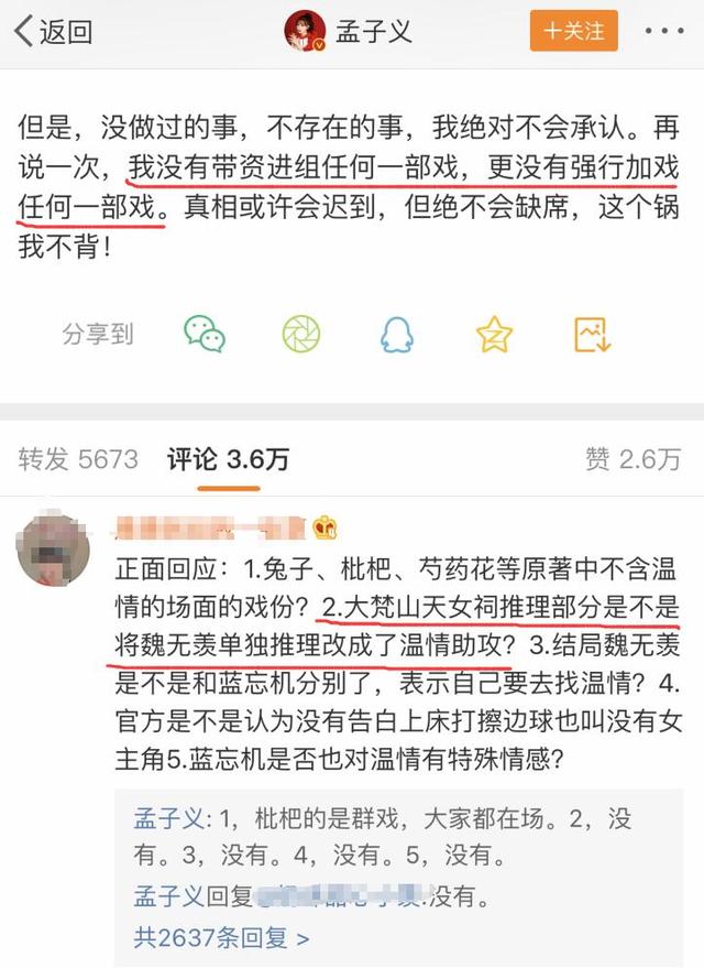 厥后正在越发严峻的骂声中,孟子义也便带资进组一事停止了回应,她称那是无中死有的事,她也未曾请求剧组给本人减戏,粉丝正在她微专以下举了几个疑问,她也均逐个停止回应,称那些戏里皆出有她。