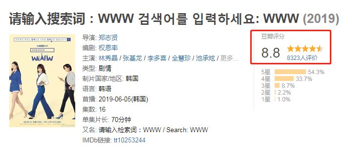 该剧由林秀晶、张基龙、李多喜、齐慧珍等人出演,报告了正在网站公司事情的女性的糊口战恋爱故事。自开播以去便备受好评,豆瓣评分更是下达8.8!