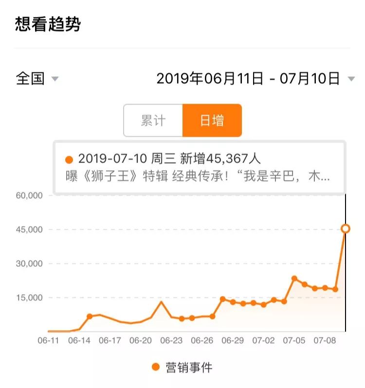 灯塔专业版数据显现,《狮子王》的念看人数,也正在7月9日到7月10日之间阅历了年夜幅度增加。