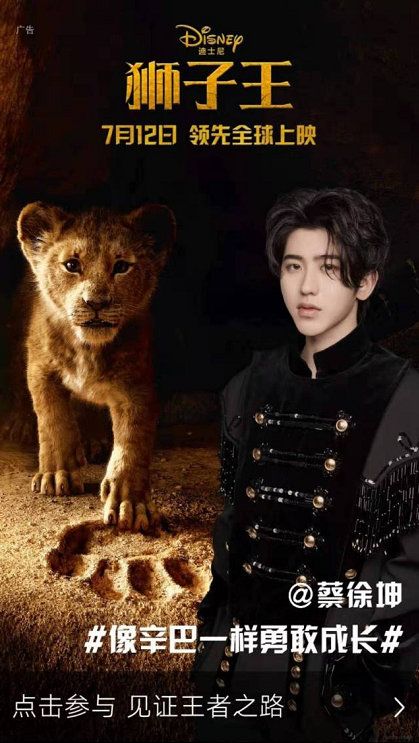 很多网友以为,“流量明星”蔡缓坤战“童年典范”《狮子王》完整没有拆边,强止绑定蔡缓坤取《狮子王》,是一种极端为难的宣收手腕。