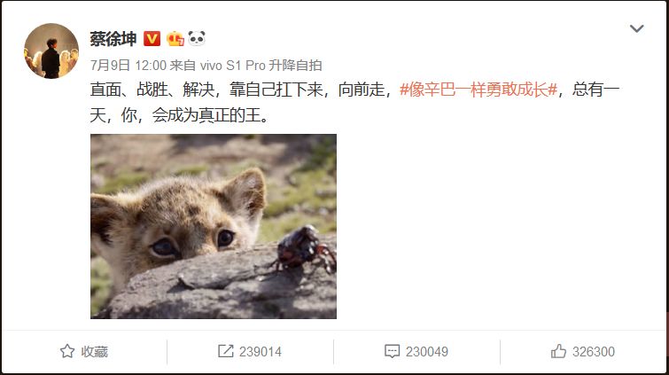 7月9日,蔡缓坤正在该话题中收了一条微专,年夜圆为《狮子王》宣扬站台。仔细的粉丝会留意到,蔡缓坤的微专界里启里图,曾经换成了《狮子王》的布景。