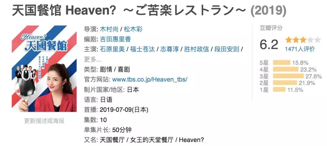 喏,道的便是7月9日刚播TBS漫改笑剧《天堂餐馆》。按照佐佐木伦子的人气漫绘改编,以“LOIN DICI(天下止境)”法度餐厅为舞台,报告怪人老板和她本性实足的伙计之间的笑剧故事。