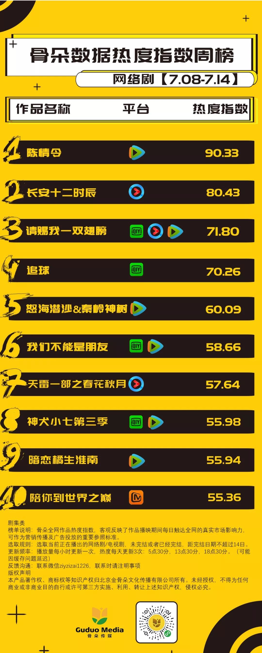 周榜前两位顺次被时装仙侠剧《陈情令》战时装悬疑剧《少安十两时候》夺得。那两部剧也别离是本周天天的骨朵热度榜日榜冠亚军。