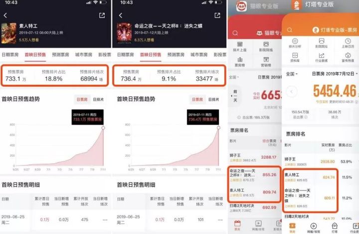 ▲ 猫眼、灯塔两个仄台的预卖及票房数占有好