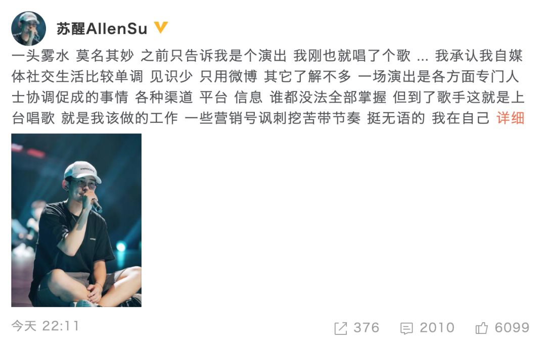 远日歌脚清醒来网白婚礼献唱被嘲,7月15日,清醒收微专回应,他一圆里称接布告前已把握局部疑息,另外一圆里暗示便是该做的事情,关于营销号讽刺挖苦带节拍以为挺好笑,并讥讽会成为当前脱心秀节目标素材。最初他借正在微专中称“戴德金主,感激糊口”。