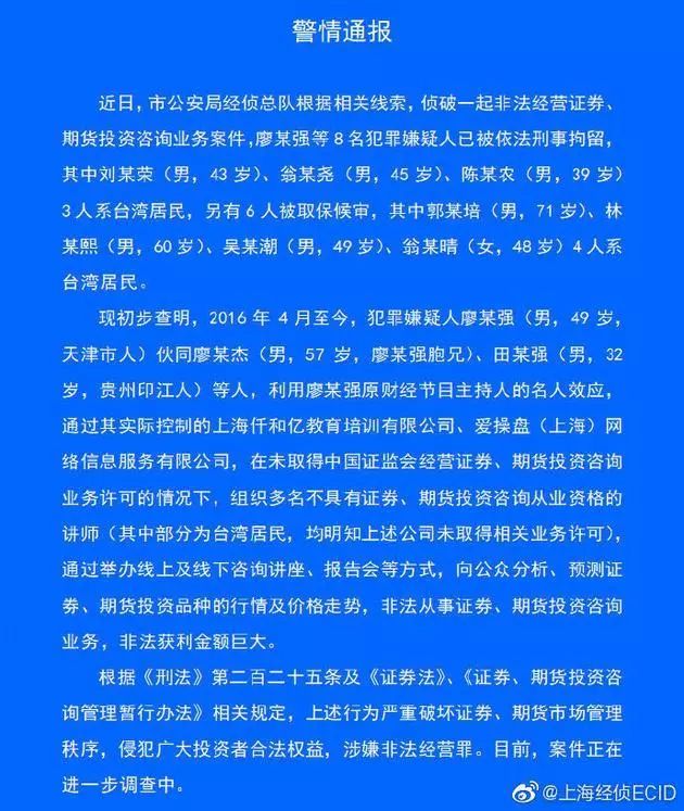 19、不法处置投资征询 本财经节目掌管人廖某强等被拘