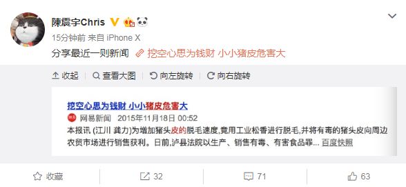陈震宇公布微专,称“分享近来一则消息”,消息链接题目为“绞尽脑汁为财帛 小小猪皮风险年夜”,疑似用谐音暗讽娱记墨皮。