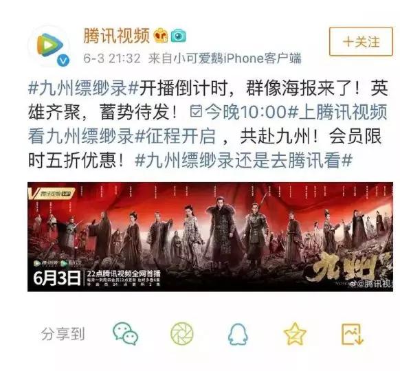 《九州缥缈录》本定档于6月3日,正在前期宣扬中,腾讯视频战劣酷曾铆足了劲女,以《九州缥缈录》挨起了一场会员争取战,以至正在开播前,腾讯视频借正在民圆微专上负责呼喊“征程开启,共赴九州,会员限时五合劣惠”。