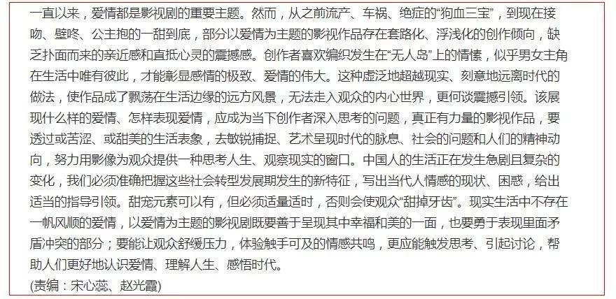 但《光亮日报》以为,恋爱是影视剧的次要主题,可一味离开理想只逃供苦辱则有些矫枉过正,会使不雅寡”苦失落牙齿“,影视剧中要表示恋爱幸运战好的一里,也要怯于表示内里冲突抵触的部门,那模样才气协助人们更好天熟悉恋爱,了解人死。