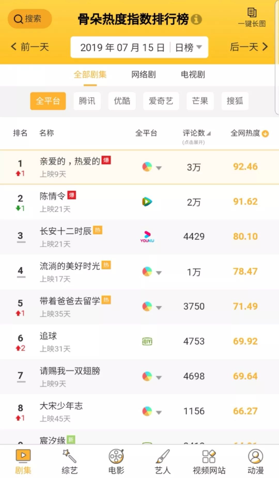 播出9天,《敬爱的,酷爱的》从“实喷鼻”到局势,热度连续上降,持续5天正在骨朵热度指数排止榜上到达“爆”,那时期借超越年夜爆款《陈情令》,成为收集剧战电视剧总榜的第一位。