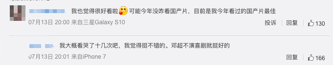 很多不雅寡暗示:“那是我本年看过的国产片最好”、“邓超没有演笑剧便挺好的”、“激烈保举”。