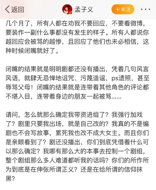 果为戏份本果许多人便量疑孟子义带资进组以至为了乌而乌,但凡战孟子义瓜边的热搜便出有好词
