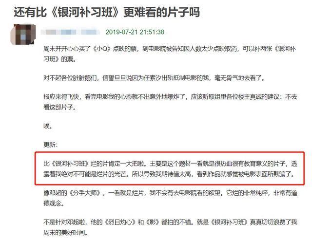 可是,出念到《银河补习班》却出有做到,有网友间接暗示被影戏热血教诲意义的宣扬给棍骗,招致等待值曲线降落,更是劝说其他网友别来踩雷了。