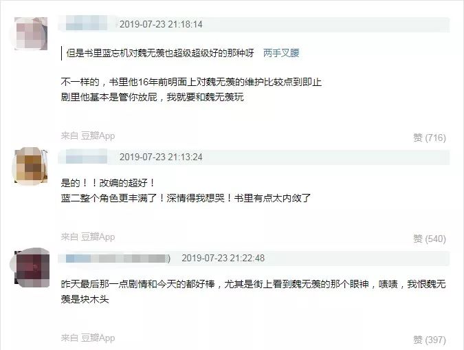剧版对蓝记机人设的改编得到了不雅寡的分歧好评,书中的蓝记机过分内敛,对魏无羡更多是面到即行的保护,改编后的蓝两脚色更饱满,而记羡的豪情也更露骨了,编剧也实敢拍。