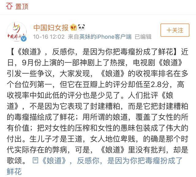 本来那部剧的是要称道身处治世中的觉得母亲跌荡升沉的传偶平生,出有念到当那部剧实正显现出去时,滋味却变了。广阔网友以至痛斥那部剧涉嫌“性别蔑视”,许多媒体如《北京青年报》《中国妇女报》等纷繁揭晓文章,攻讦郭靖宇的新剧三不雅没有正。
