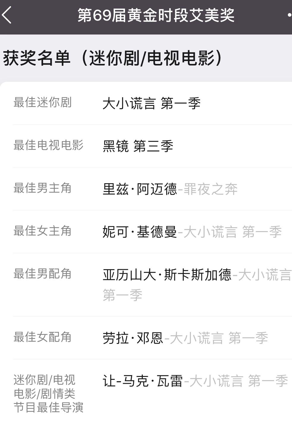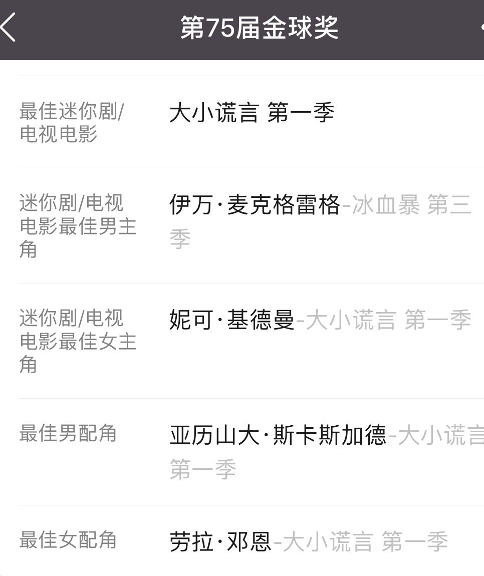 《巨细谎话》第一季正在好国金球奖、艾好奖上获奖颇歉。特别是演出奖,妮可基德曼得到了最好女配角,劳推邓恩则得到了最好女副角,别的借有最好男副角。