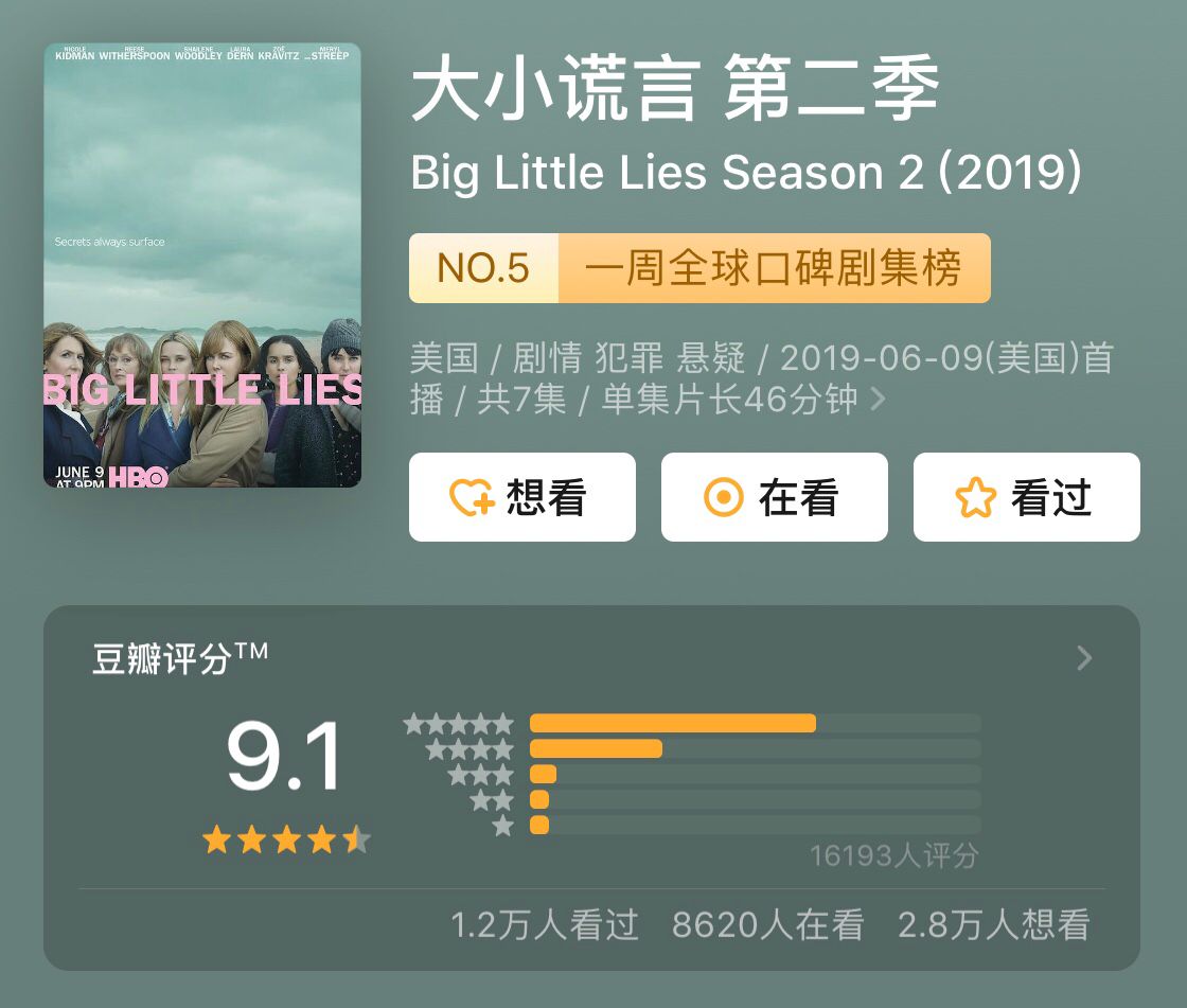 《巨细谎话》第两季是HBO推出的年度年夜戏。撤除第一部的本班人马以外,演技年夜神梅丽我斯特里普自动减盟该剧扮演“恶婆婆”,让该剧吸收力爆棚。而正在剧中扮演梅丽我斯特里普“女媳”的则是妮可基德曼。那两位奥斯卡影后已经协作过《不时刻刻》,妮可也果为那部影戏博得了奥斯卡影后桂冠。
