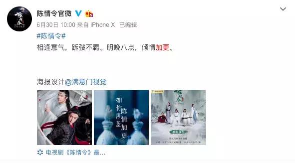 同时,《陈情令》持续三周连任新剧艺恩播映指数第一位,正在2019年上线局部收集剧30日播映指数中排名榜尾,正在2019年上线收集剧30日用户热度中一样位居尾位。