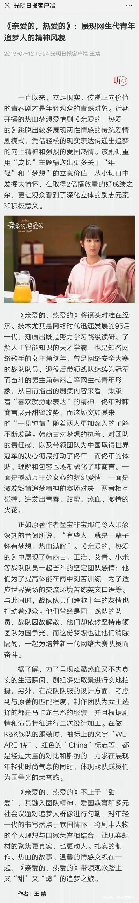 而那部剧才播出没有暂以后,便被光亮日报面评,光亮日报写的题目是:阵线网死的青年逃梦人的肉体风采。实在那部剧光看名字便很正能量了,的确,那部剧除两小我私家苦苦的爱情以外,借有关于胡想的逃供,正在豪情以外借能让您感触感染到热血取热情,借有对胡想的固执。也恰是果为那部剧对主题掌握的十分好,也是如今热播的本果吧。您们关于那部剧是怎样看的?欢送正在下圆批评留行
