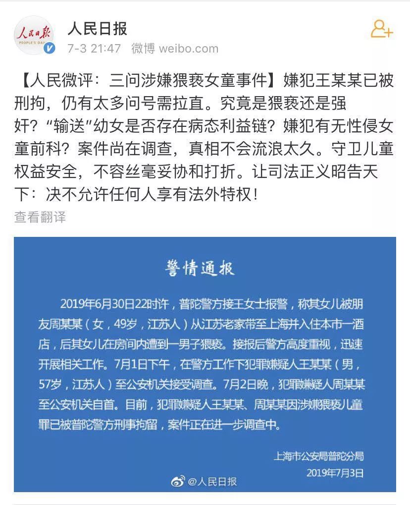 7月1日,上海市一家上市公司57岁的董事少果性侵女童被刑拘。
