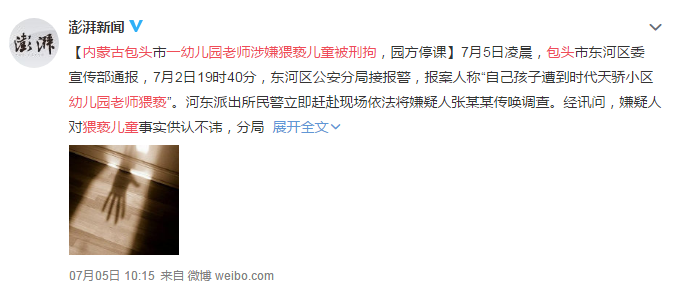 7月2日,内受古包头一幼女园教师涉嫌猥亵女童被刑拘。