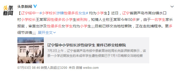 7月1日,辽宁绥中一小教校少果性侵多论理学死被刑拘。