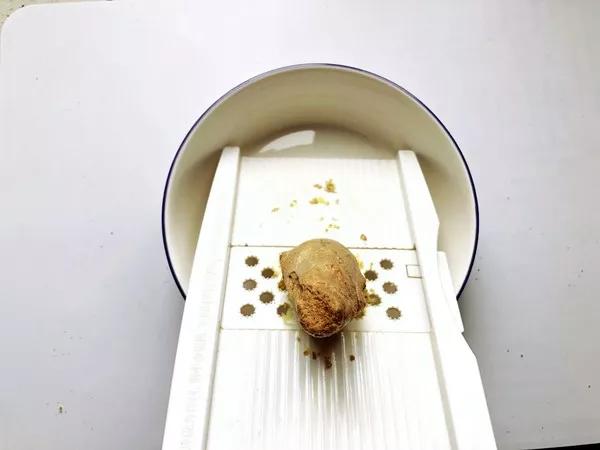 2.将老姜洗洁净后擦干,假如脾胃实热者需求将姜皮来失落。普通人群能够没有来皮。用擦丝板把姜擦成姜蓉。