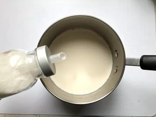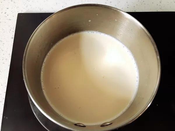 4.把黑糖战牛奶局部倒进奶锅中,将黑糖搅拌平均。