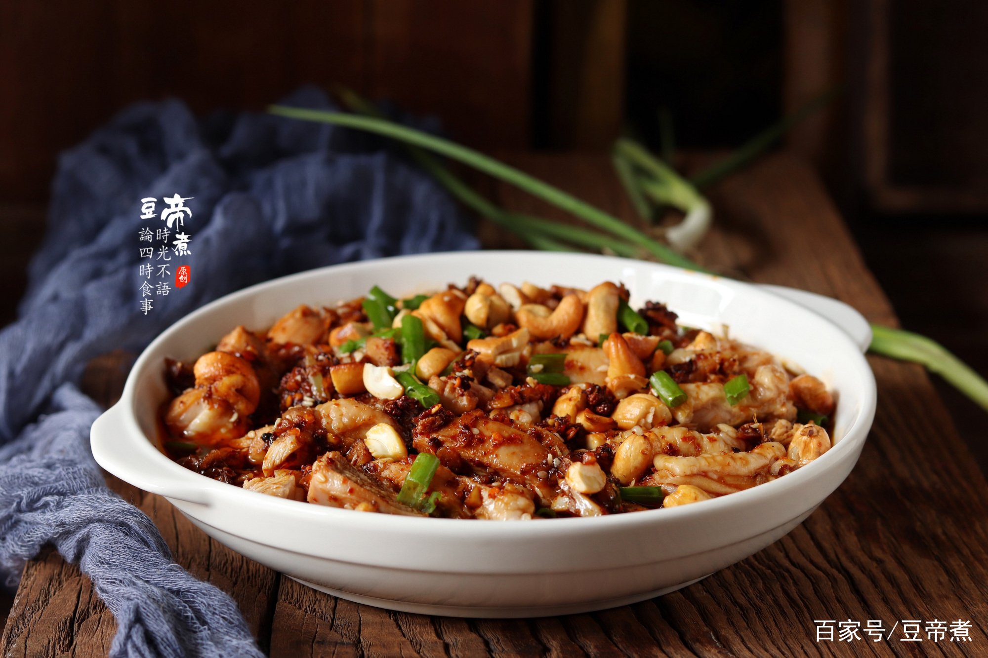 食材:鸡腿7个、腰果200克、青翠2根、老姜2片、花椒1撮、喷鼻叶1片