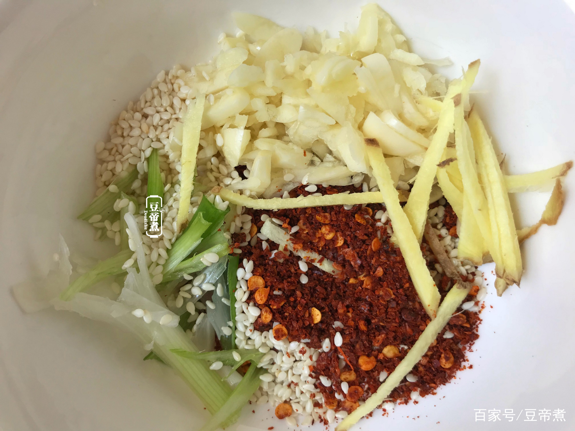 5、与个小碗把辣椒粉、老姜丝、黑芝麻战葱黑放正在一同,锅烧热少量油淋进。然后搅拌搅拌,待温度略微降落再参加盈余的调味料搅拌平均。
