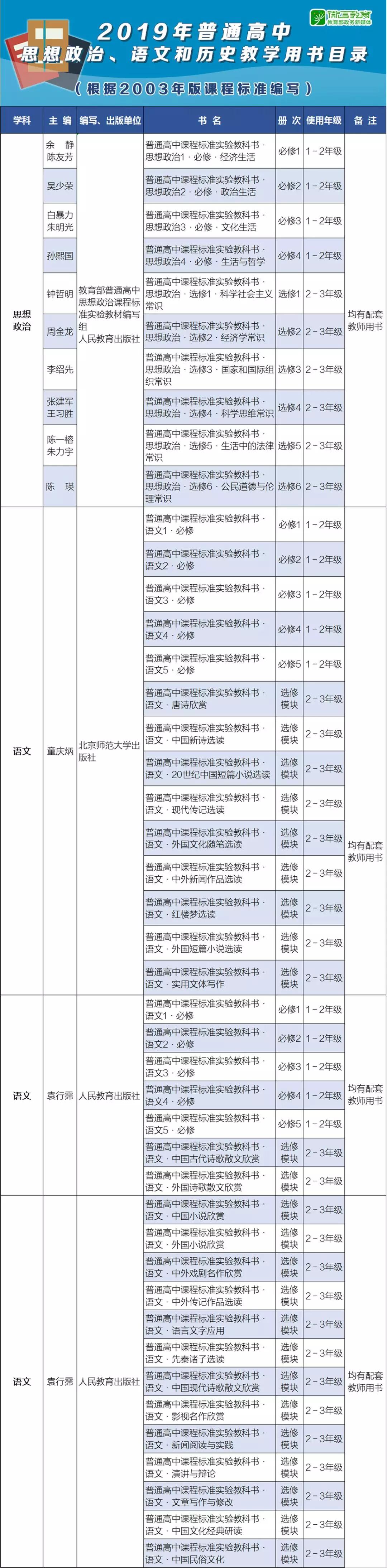 教诲部宣布2019年一般下中思惟政治、语文战汗青讲授用书目次。