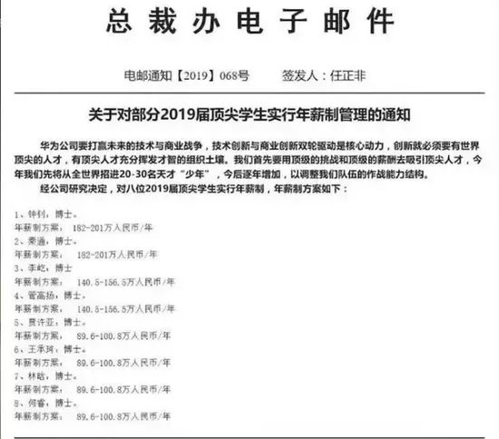 远日,华为开创人任正非签收了一份总裁办电子邮件,颁布发表对部门2019届顶尖教死真止年薪造办理。