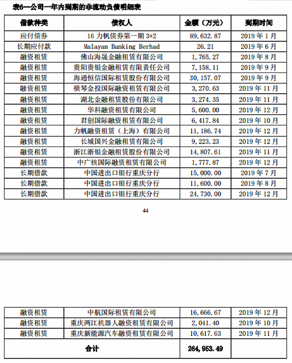 按照年报,停止2018年末,力帆股分活动欠债账里余额187.8亿元。此中,短时间告贷91.61亿元,对付单据及对付账款开计41.81亿元,其他对付款23.26亿元,一年内到期的非活动欠债26.5亿元。本年下半年险些每一个月皆有准期而至的债权,此中也包罗前里提到的过期的海通恒疑租赁战横琴金投租赁的债权。