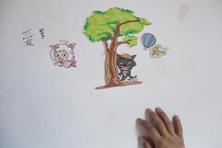 他们家中的墙壁被小杰揭上了很多卡通揭纸,有喜羊羊战灰太狼,借有小佳丽鱼。小芳正在一处揭纸旁凭印象写下了“爱号(好)”。