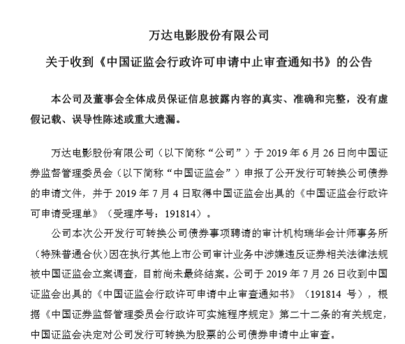 7月29日,万达影戏公布通告称,背中国证监会申报的公然刊行可转换公司债券事项于7月26日支到证监会出具的《中国证监会止政答应申请中断检查告诉书》。