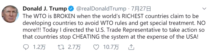 “当天下上最富有的国度自称开展中国度,以躲避WTO划定规矩并得到特别报酬时,WTO便曾经垮失落了。实是够了!!!”