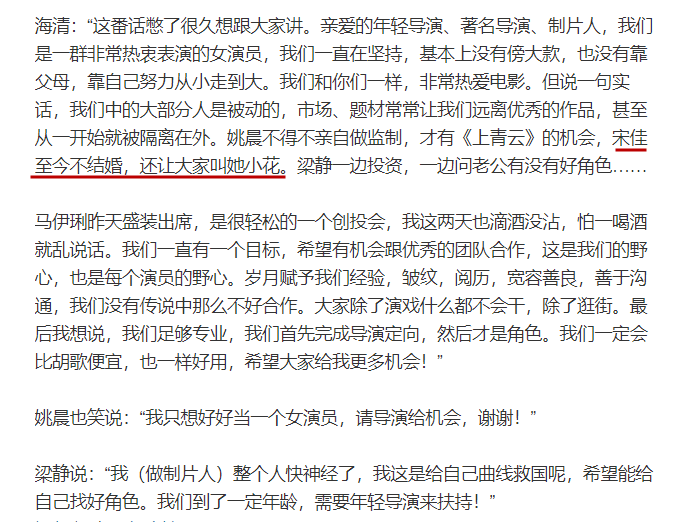 接着,站正在C位的海浑沉着的取出脚机,经由过程早已筹办好的台词并讲了一段冗杂的“演讲稿”,而内容大抵走背是海浑以中年女演员为代表,背影戏止业导演、造片人等喊话,吸吁对圆正在选择演员时能看到像她们那样的勤奋的、被动的、仍然好用的中年女演员,也期望导演造片们赐与中死代女演员时机等。