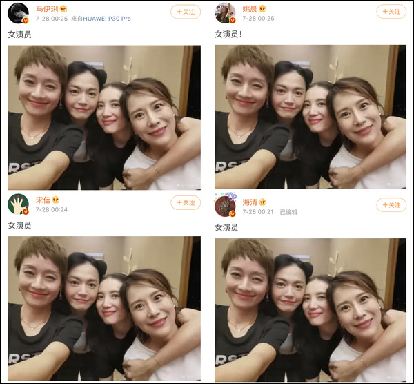 她们正在微专上不只收的是统一张开照,连配文也皆是“女演员”三个字。